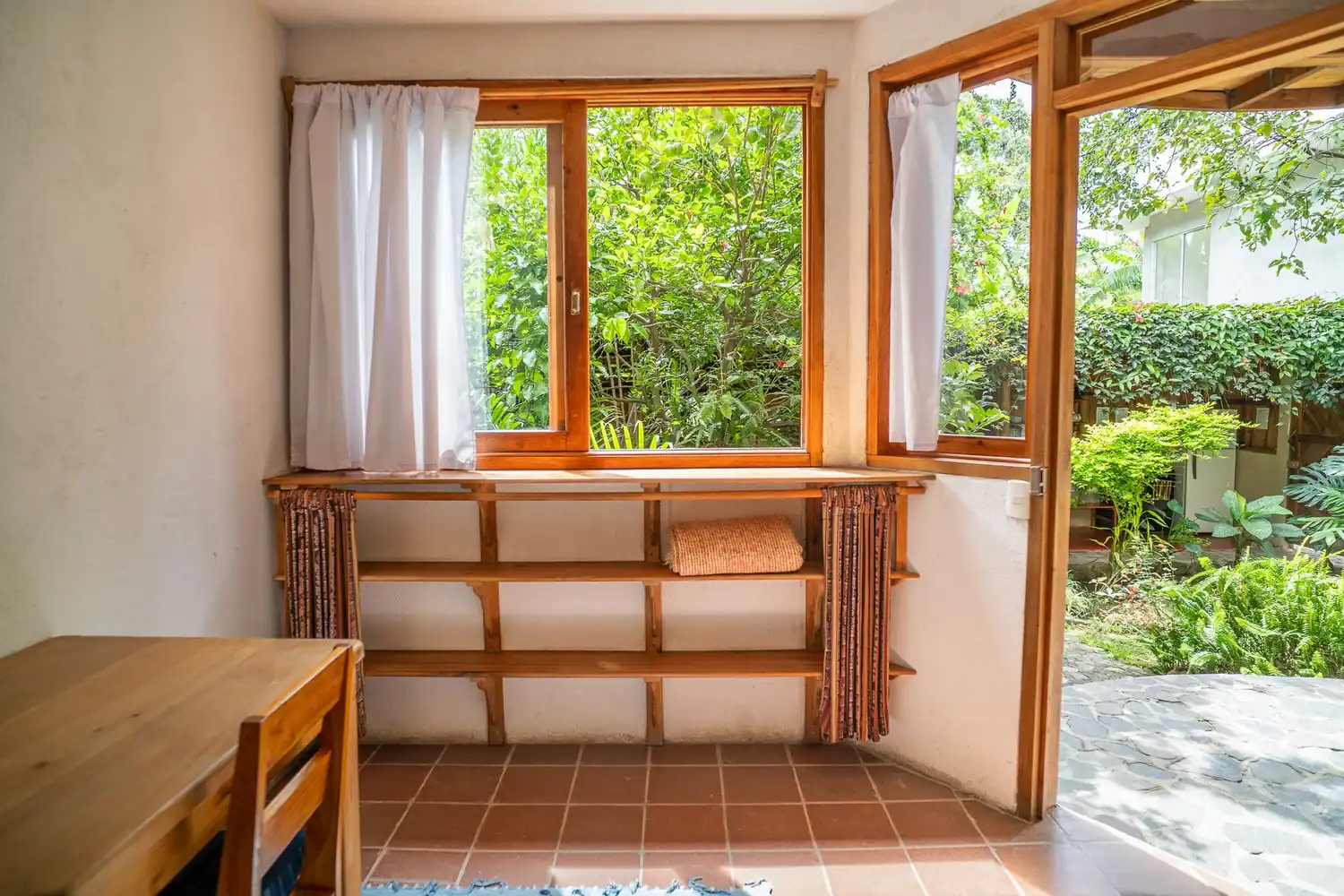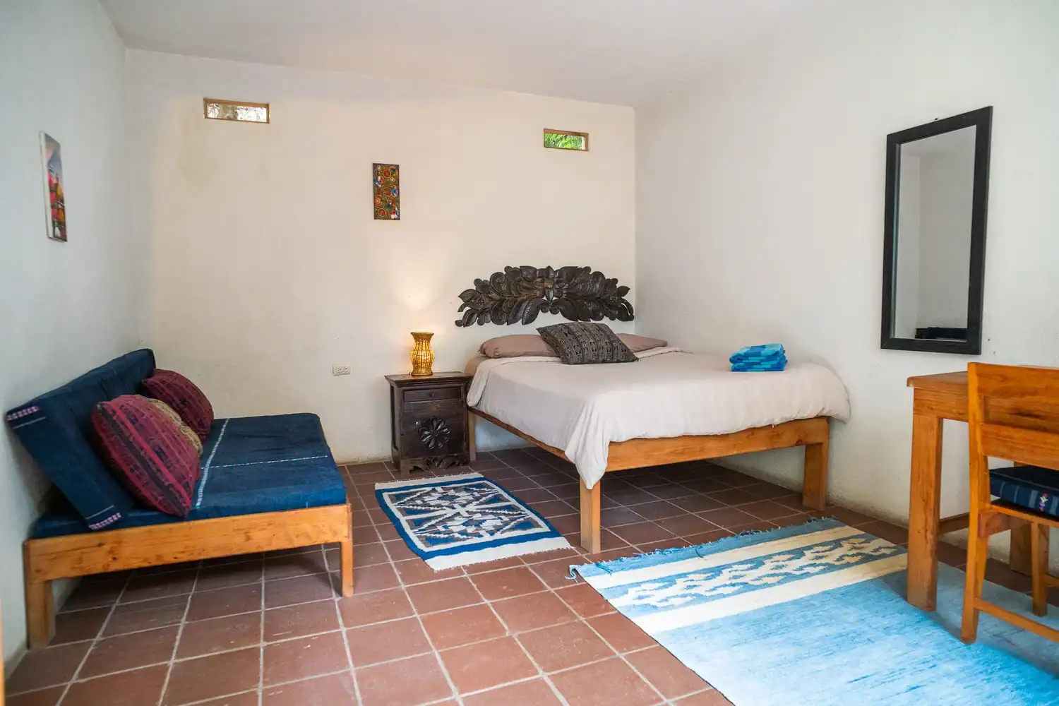 The Venga Guesthouse offers four thoughtfully designed rooms, each including a comfortable double bed and a convertible sofa-bed, along with a desk/chair and access to shared communal spaces. Two upstairs rooms share a charming balcony overlooking the garden, while the two downstairs rooms provide easy access to the garden and shared kitchen.
